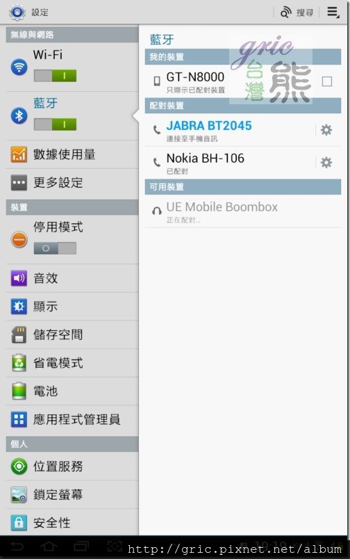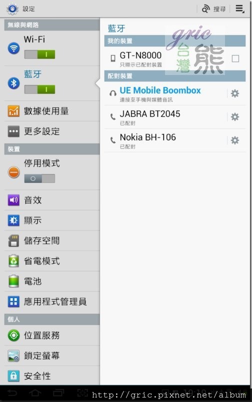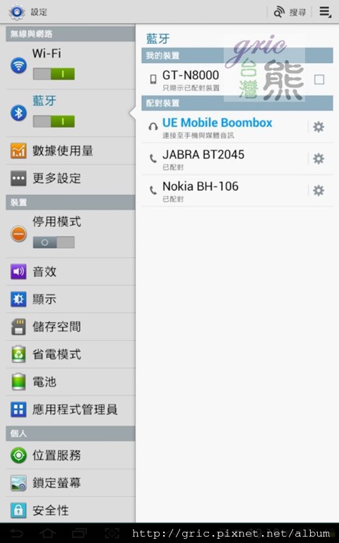 測試的過程,熊熊有被嚇到…因為一開始的時候蕭煌奇的你是我的眼…,沒辦法一次就順利的唱完…XD,但是鎮定冷靜的熊相信這問題應該跟Logitech UE喇叭無關…才對,所以趕緊再拿出GALAXY NOTE第一代測試,果然順暢沒問題。再搬出SAMSUNG NOTE 10.1確認一下,OK也是順暢沒有問題 (所以配對截圖才會是GT-N8000) 。問題應該是出在熊一開始使用的SAMSUNG 第一代TAB 7的藍芽,它的傳輸不順,所以讓一條歌唱的哩哩落落的。不過用TAB 7平板玩candy crush,遊戲音樂變得好立體,連講話的與音都變得好有磁性,玩起來爽度有提升。