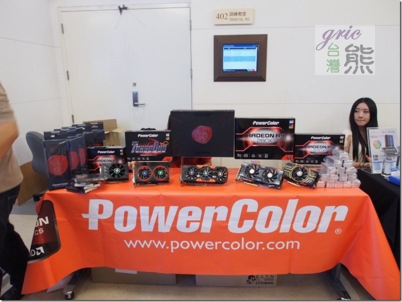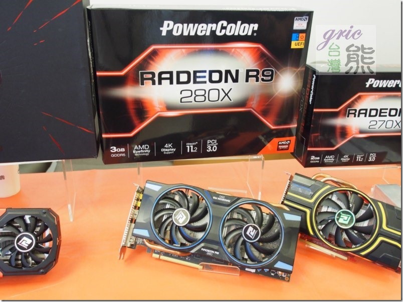 圖 X52-X54 PowerColor 悄悄的將當時還未上市的AMD新一代 R9顯示卡R9 280X、R9 270X與R7 260X展了出來,連最新的單晶片卡王R9 290X都悄悄在另一桌現身,讓台灣熊好期待看到她的武力表現!不要懷疑,新的AMD顯卡命名規則改變了,有興趣的網友可以參考文末的連結了解原因。