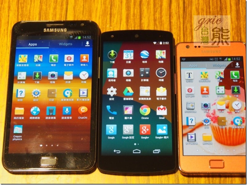 這一個部分就分兩個部分進行分享,一是實機簡單操作與機內資訊分享,二是拿Google nexus 5與SAMSUNG的NOTE、Galaxy S2還有apple的iPhone 5做簡單的外觀與螢幕視覺比較PK一下。但是也請讀者記得…這四台智慧手機的初售價位並不相同,nexus 5是這裡面上市價格最低的一台,這一個基礎參考因素也別忘記。