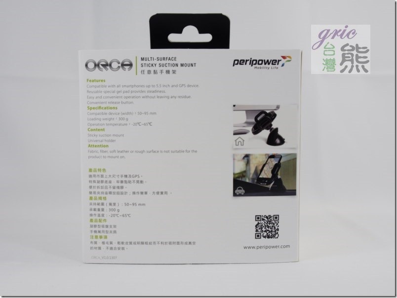 ORCA任意黏萬用車架因為就是簡單的小物,所以規格等諸元就請直接由包裝外觀觀看,PeriPower的包裝手法其實熊一直還蠻喜歡的,這一組ORCA任意黏萬用車架採用黑白加上局部燙銀,感覺質感不錯。
