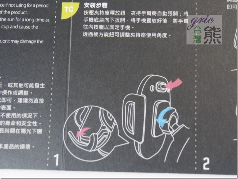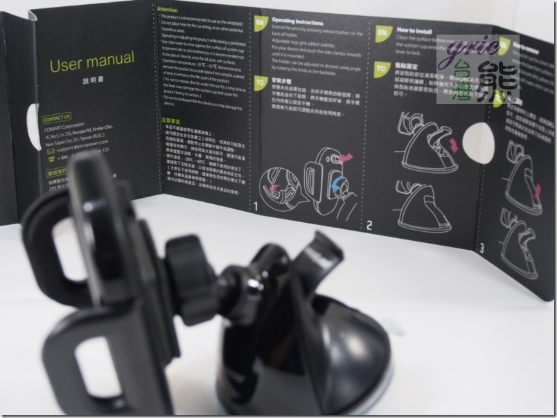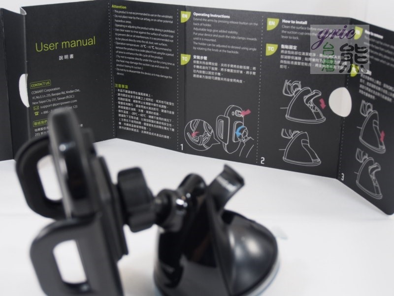 圖 O12-O15 手冊簡潔印刷清楚,注意事項要注意看清楚就是了,千萬不要黏在安全氣囊上面。還有不建議安裝在擋風玻璃之上,這熊在玻璃辦公桌上測試過,真的超黏的很難拔下來,但這不是重點,重點應該是陽光直射與高熱會讓膠變質,吸盤變形,這一部分是熊的猜測,根據以前的它牌舊款車架的經驗。