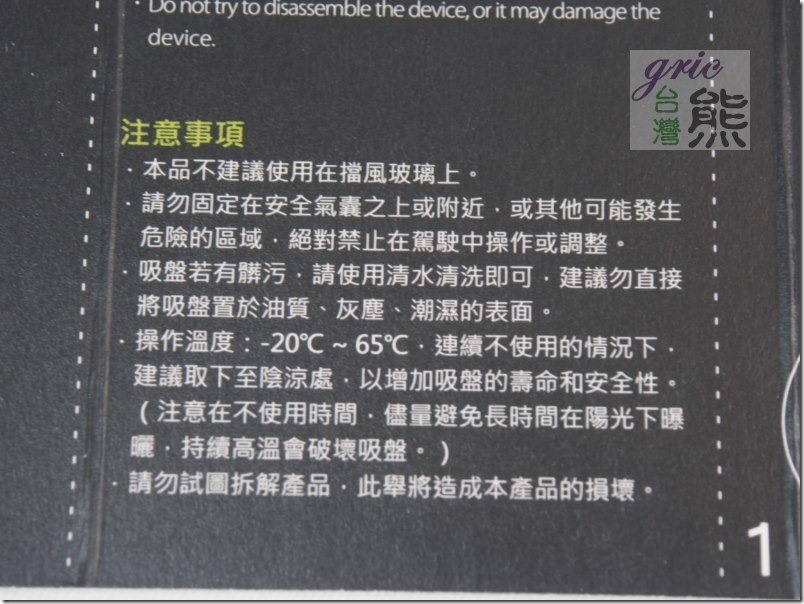 適合的溫度在-20~65℃,所以車檯如果陽光直射建議蓋一塊布或是遮陽板,不然就是像熊一樣帶進辦公室接著用,反正它的吸盤凝膠髒了不黏了只要用水洗一下乾了就恢復黏性,所以隨機附的那個塑膠小圓貼熊都沒丟掉。