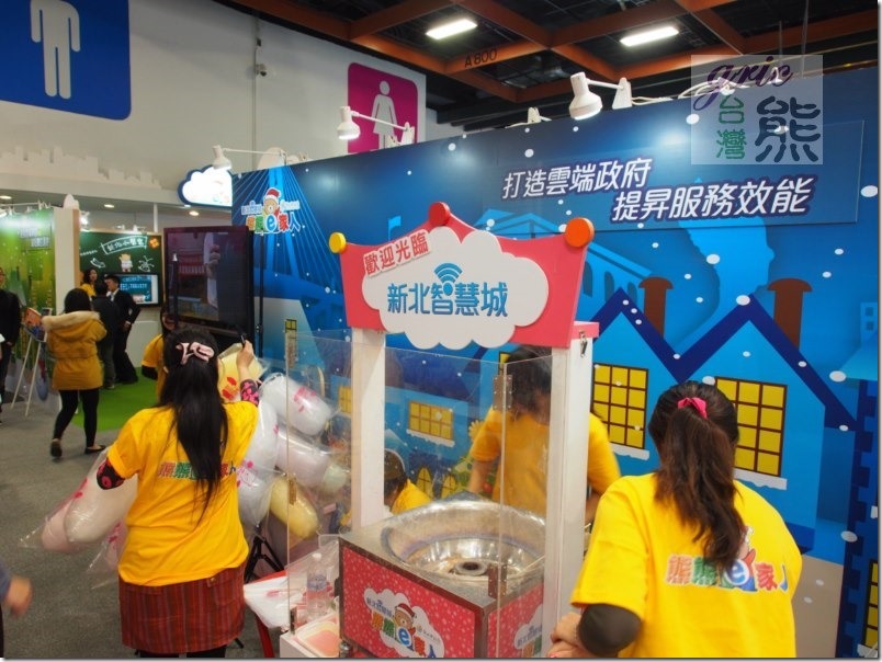 圖 E02-E04 新北市政府這次用貼近市民的圖騰與形象,來宣導與加速推動新北智慧城,相信對整體的數位e化成果的呈現,與積極的增加多用網路少用馬路的e化服務接受度應該會有不錯的助益。抬頭一看醒目的黃白熊型氣球,與熊熊e家人形象熊塔,增加新北市政府(New Taipei City Government) 「新北智慧城-熊熊e家人」展示館的能見度,不只如此連大會都悄悄的幫新北市府不了暗樁,有隱藏版的熊熊e家人來幫忙導引大家到這裡來參觀,文末分享暗裝在哪裡…(笑~)!