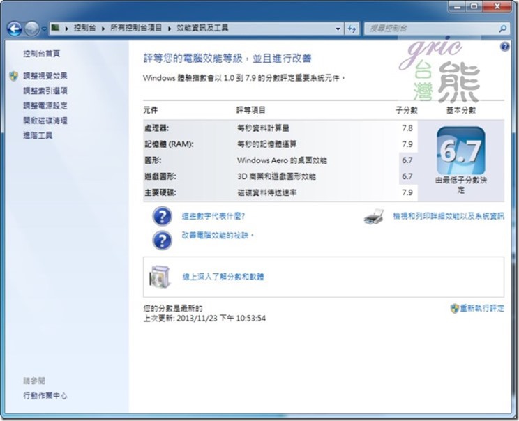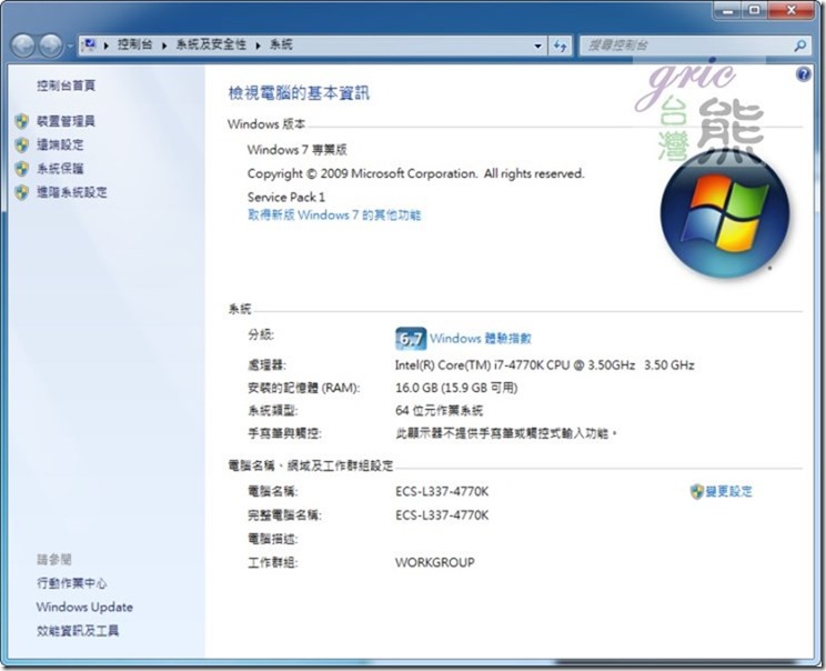 圖 L19-L20 首先上台的是Windows 7效能體驗指數,7.8 / 7.9 / 6.7 / 6.7 / 7.9 ,CPU就差臨門一腳就攻頂,Kingston的記憶體與SSD得到滿分7.9,intel HD4600也取得不錯的6.7成績,在以往這樣的成績是依定要插獨立顯示卡才能達成,現在intel的內顯已經不容小覷,有接近中階顯卡的效能!(所以買i7-4770K的人可以考慮就顯卡是中階以下就不要再插上去了…笑~)