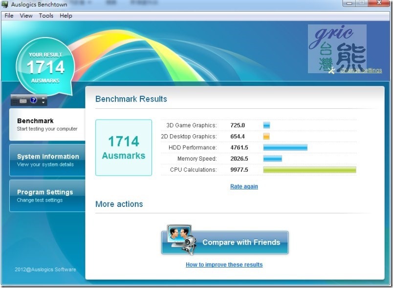 圖 L26 Auslogics Benchtown : 1714 , 725/ 654.4/ 4761.5/ 2026.5/ 9977.5 。