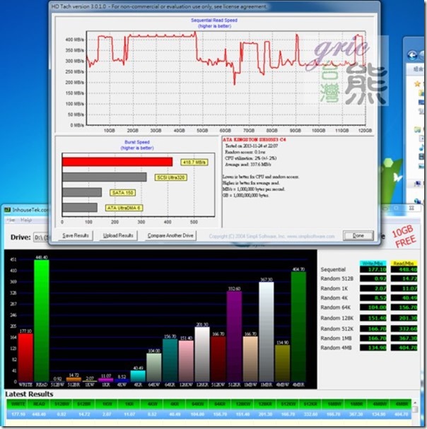 圖 L39 HD Tach的測試成績 Burst Speed 418.7.1MB/s Read Avg. 337.6 MB/s。