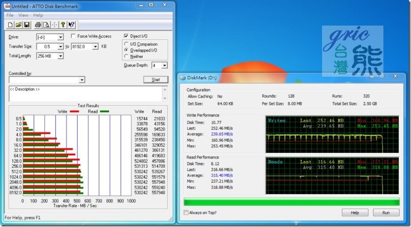 DiskMark Write平均239.65 MB/s , Read 平均315.40 MB/s 。與之前的SH103S3/240G對比各有高低,有可能是主機板等測試平台相關條件上的特性差異,也不排除是SSD各自的性能差別。