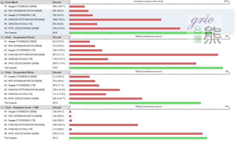 圖 L45 在PerformanceTest 8的磁碟測試成績,比表列的Intel 520 240GB SSDSC2CW240A3效能表現好。