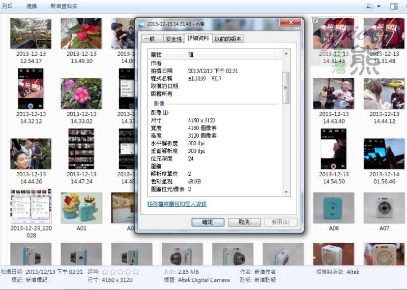 EXIF資訊A40:f/3.3、1/160秒、ISO-125、焦距4mm、最大光圈3.4、分區測光、無閃燈,35mm焦距30。檔案大小3.11MB。