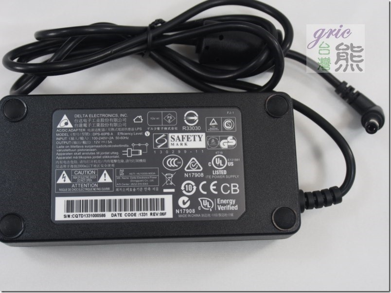圖 A14 變壓器是台達電子工業生產的,INPUT AC 100~240V / 2A /50-60Hz,OUTPUT DC 12V / 5A 內正外負。