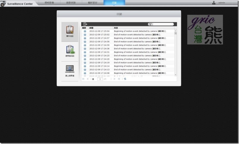 圖 A55-A59 完成上面的動作偏好設定之後會回到Surveillance Center的主畫面(A55),點擊攝影機就可以看到即時影像已經呈現列表的小圖示窗與錄影中(A56),有提供詳細的日誌紀錄可查(A57),順便看一下四分割與單一大畫面,VIVOTEK IP8131W畫質真的錄得很清晰。