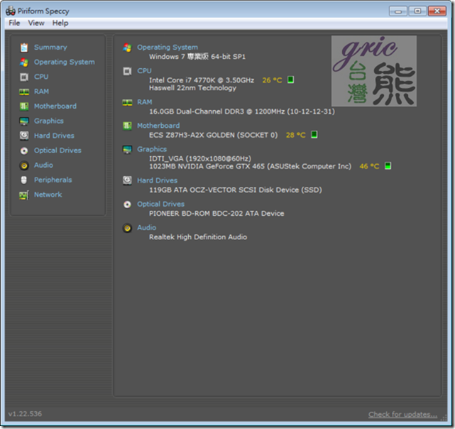 圖 A94這次的測試平台是intel i7-4770K與 ECS精英的L337 GANK Z87H3-A2X GOLDEN主機板,採用PATRiOT PC3-19200-PV316G240C0K DDR3-2400 16GB與KingSton HyperX 240G SSD,及使用ThermalTake Chasar A71機殼搭配OCZ-FTY550W FATAL1TY 550W POWER的組合作為測試平台。喔~還有老舊的GTX-465與使用Windows 7 64位元系統。