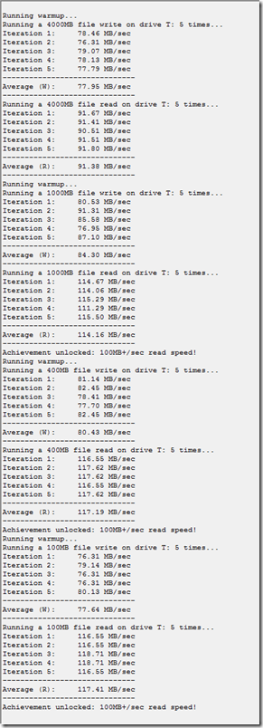 寫入的表現平均就在80 MB/sec以上、讀取110 MB/sec,都呈現平穩與還不錯的成績(以上測試均在內、外網路通暢情形下進行,不排除有其他網路訊號干擾之可能)。