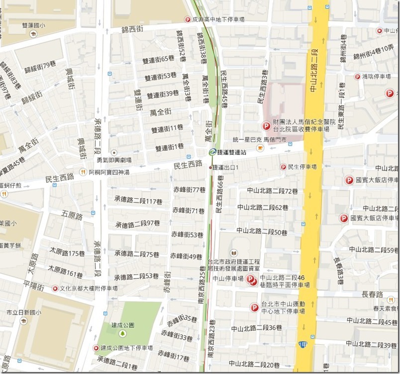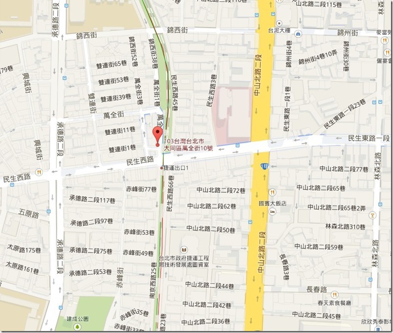 基本上鎖定中山北路民生西路與承德路民生西路口應該就很容易抵達,停車可以優先利用錦西街上的成淵高中地下停車場,或是靠近長春路的台北市中山運動中心停車場,還有承德路上靠近南京西路的建成公園地下停車場可以利用,只是下車後須步行6~10分鐘, 最近的是馬偕與對面巷內的民生停車場下車步行就5~7分鐘可達。