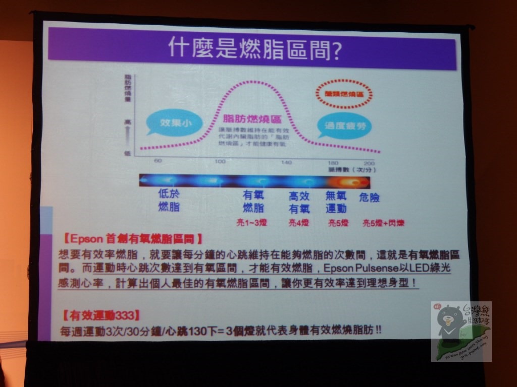接下來…,因為熊自己去體驗過後,覺得由這場體會中獲得了相當多的健康運動與健身、減肥的相關經驗與數據,包括一些以前沒有接觸過的專有名詞與數據。自己覺得相當有用,未來也會搭配這樣的技巧與秘訣來配合Epson PULSENSE PS-500進行自己的健康經營大業,所以當然要發揮部落客愛分享與不怕麻煩及不藏私的精神跟大家分享一下當天的一些資料。