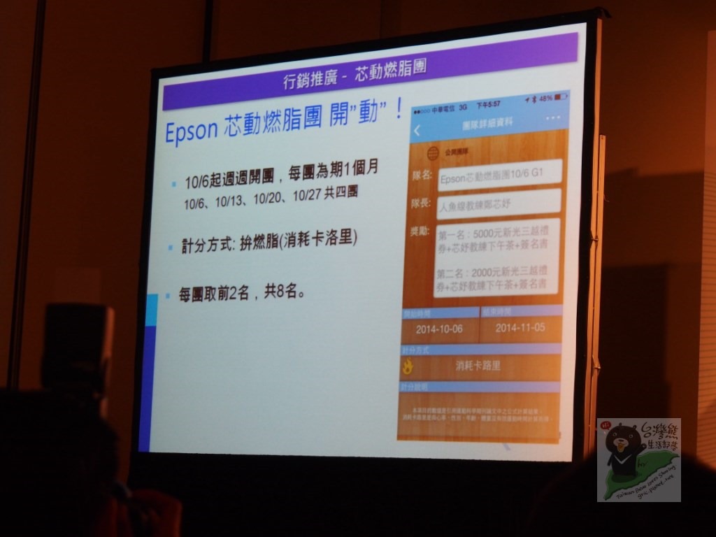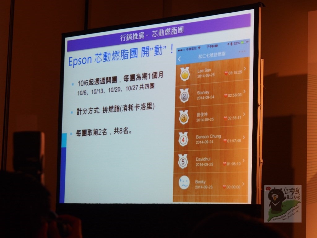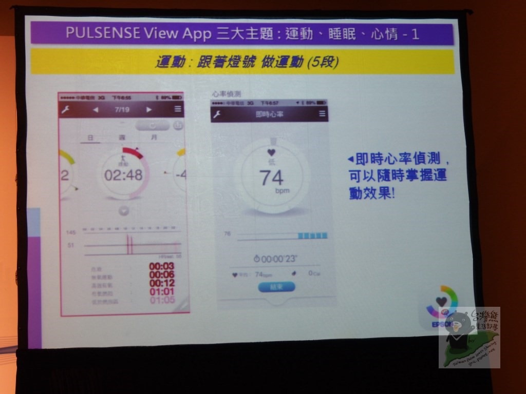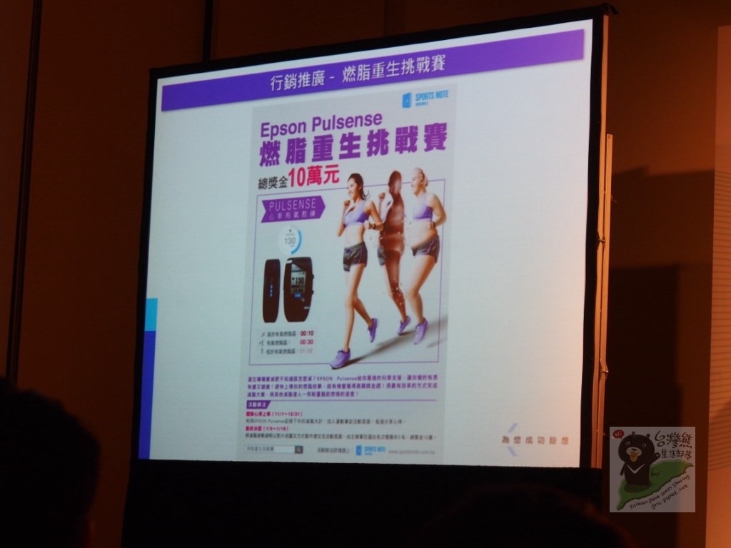 整個體驗活動在健身筆記 寶林的開場介紹下展開,包括邱老師現場教大家與帶領大家做了30分鐘的有氧運動,不要說只有30分鐘,這真的是會讓你心跳飆上130,而且流汗耶~(累~)!只是這一段沒辦法線上跟大家分享,但是接下來的一些文字畫面很重要喔,雖然熊沒辦法一一搭配圖面詳細說明,但相信簡潔的圖文一定能讓有需要的人產生感應,接下來看了就知道!當然還有包括 Epson PULSENSE PS-500、Epson PULSENSE PS-100的一些簡單資訊,以及一些好康的活動...有總獎金10萬的活動喔!所以繼續往下看喔!