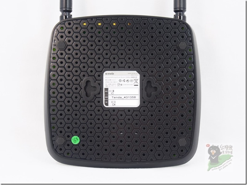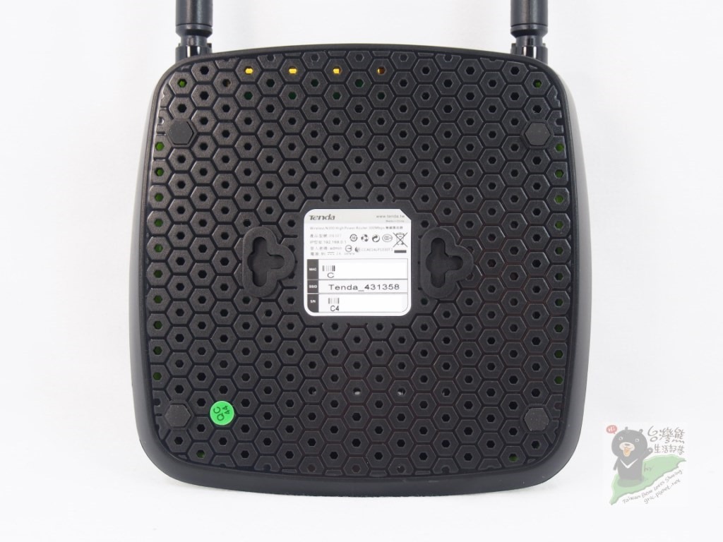 之前的建議騰達有聽進去,TENDA FH307有壁掛孔的設計,蜂巢式的孔狀設計對散熱自然有幫助。底部還註記預設的IP:192.168.0.1 及預設密碼 admin,所以提醒登入之後密碼要改,無線密碼也要改。