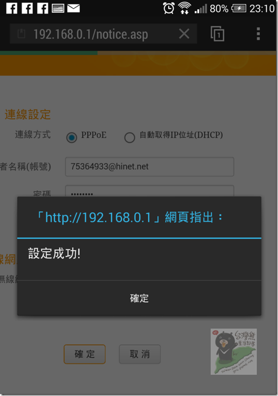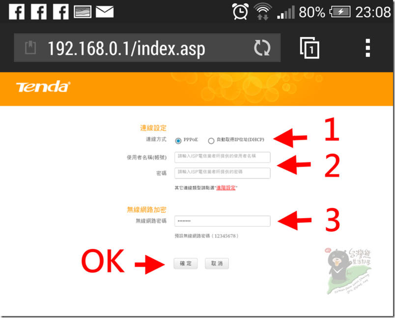 圖 F17-F20 ↓ 安裝很簡單,先插上網路線、然後插上電源,然後用手機或電腦連上FH307,輸入admin預設密碼,然後依序選取PPPOE或是DHCP(使用無線網路者後面單元有簡單示範),輸入帳號密碼、順便改一下無線網路的登入密碼(SSID),預設是12345678很容易猜的。