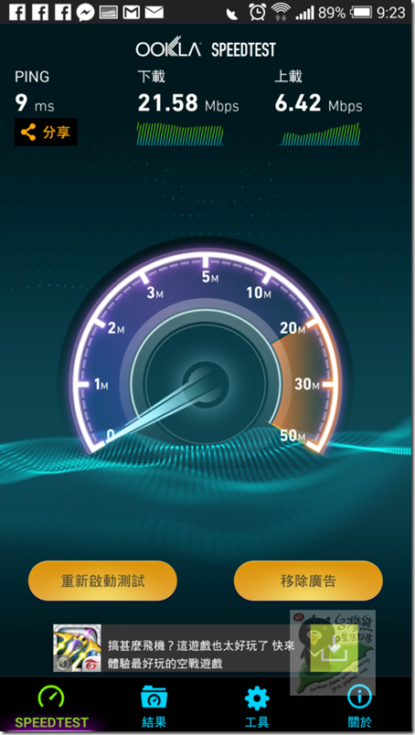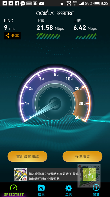 速度是下載 21.58 (41.74) / 上傳 6.42 (31.71) Mbps / PING 9 (8)ms,忠實反映出3到厚牆的威力,速度掉下來了,不過表現還是算不錯,所以沒有強訊的時候FH307也是不錯用的!