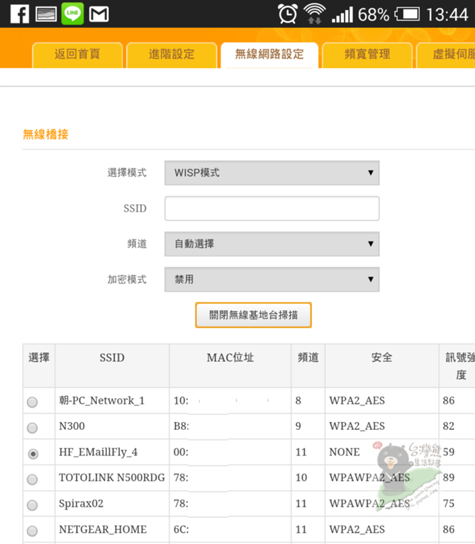 圖 F39-F41 FH307支援無線橋接,這裡直接示範WISP模式,利用內建的無線基地台掃描功能,讓你比設定有線更輕鬆簡單!