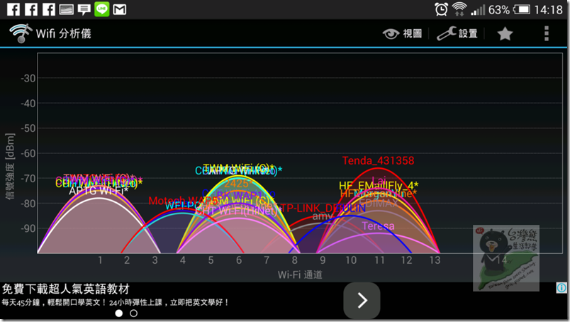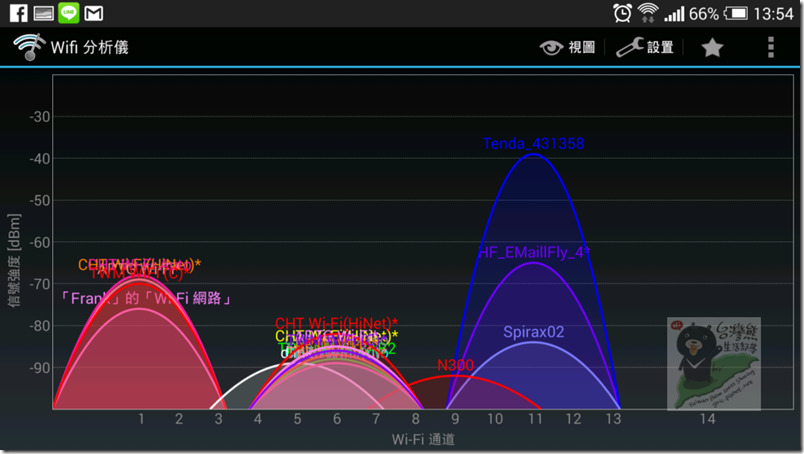 圖 F51-F53 ↓ 接下來到對面騎樓下,來個遙遙相望!一堆AP冒出頭了…,幸好TENDA FH307還是很爭氣,測到-62dBm。