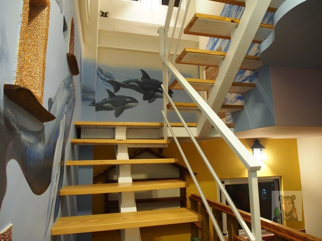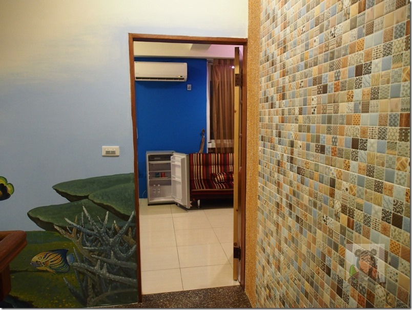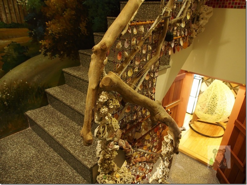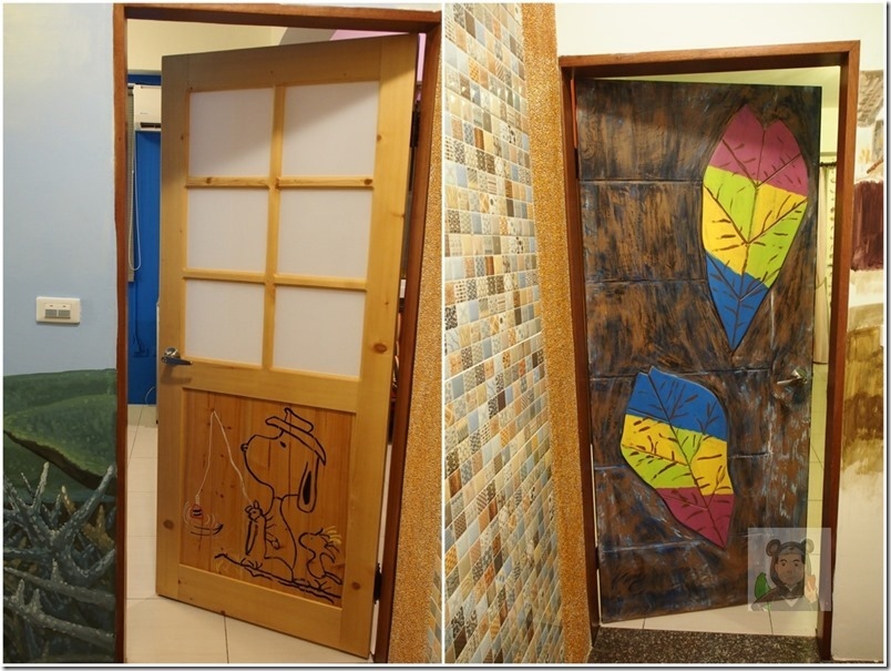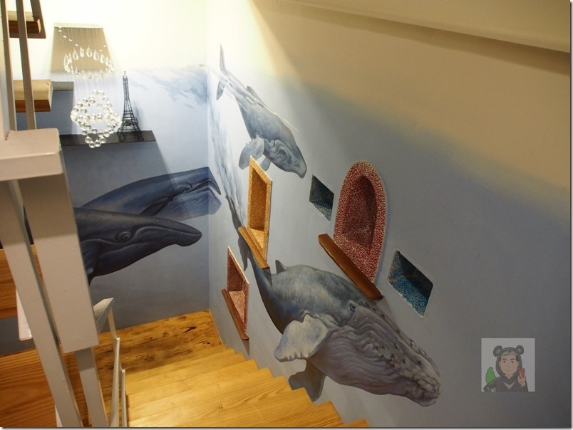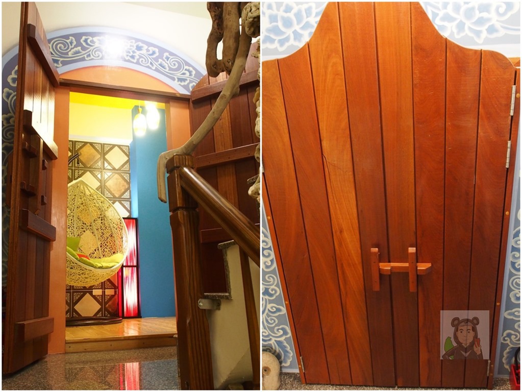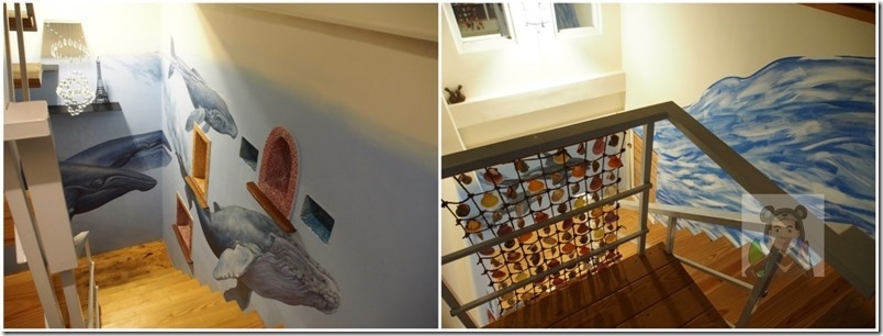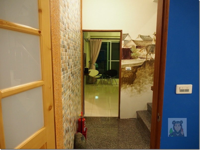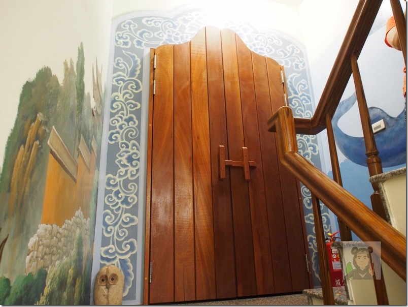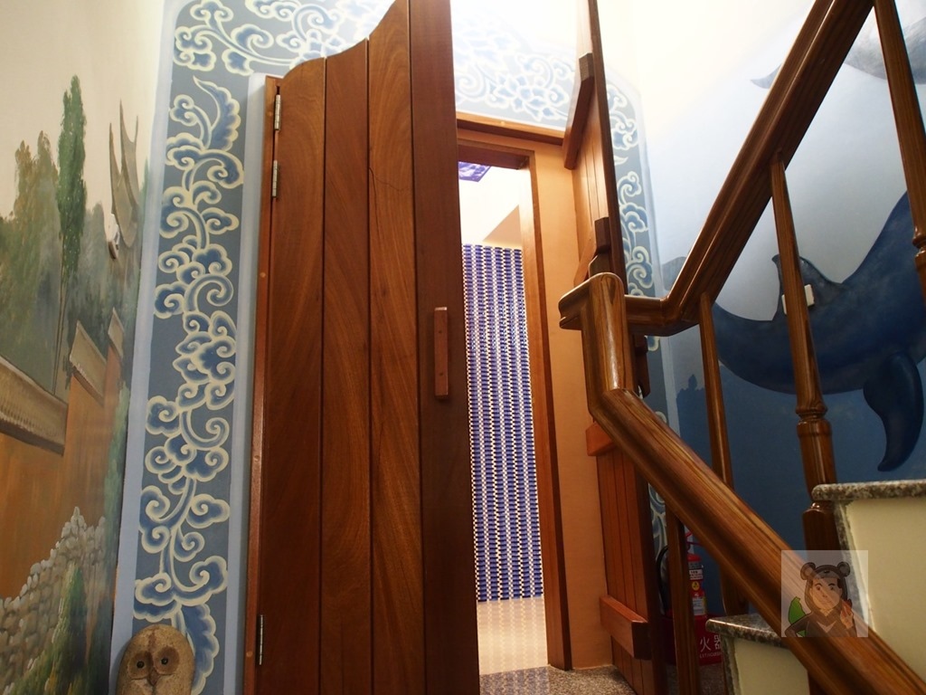 是不是發現…牆壁彩繪…由農村景置到頂樓的海洋世界,美城樓都有不同的主題喔!民宿主人的用心不只於此,還有梯間用材與仿古木栓大門…是不是感覺別有風味,所以說用心的民宿也可以讓你有探索與新鮮的感官享受…別忘了…還沒看到房間裡哩! ^_^