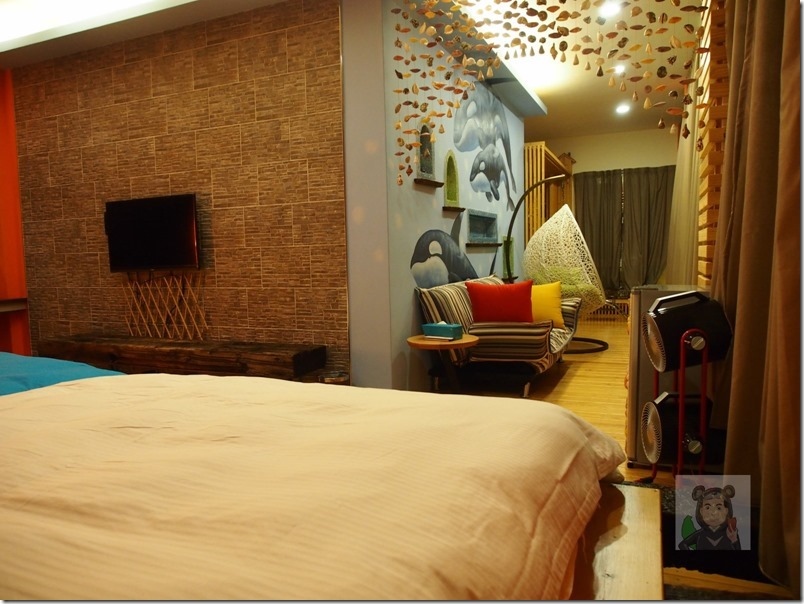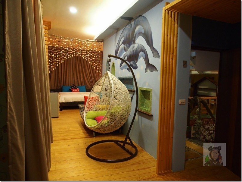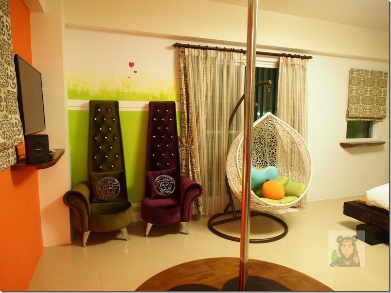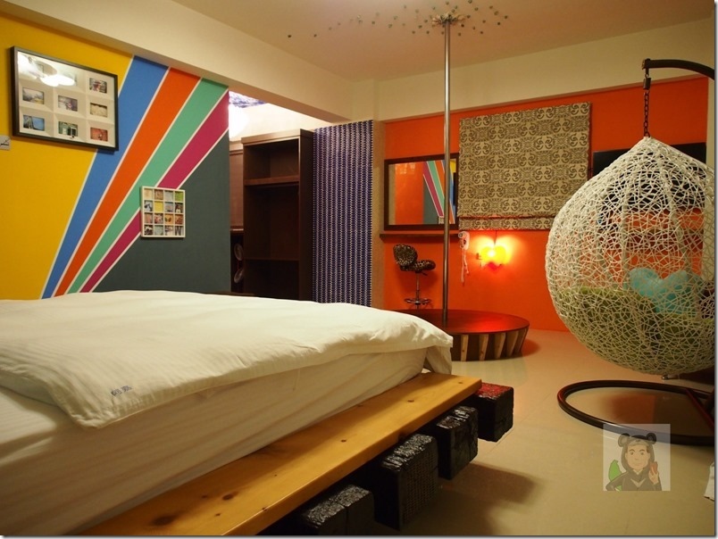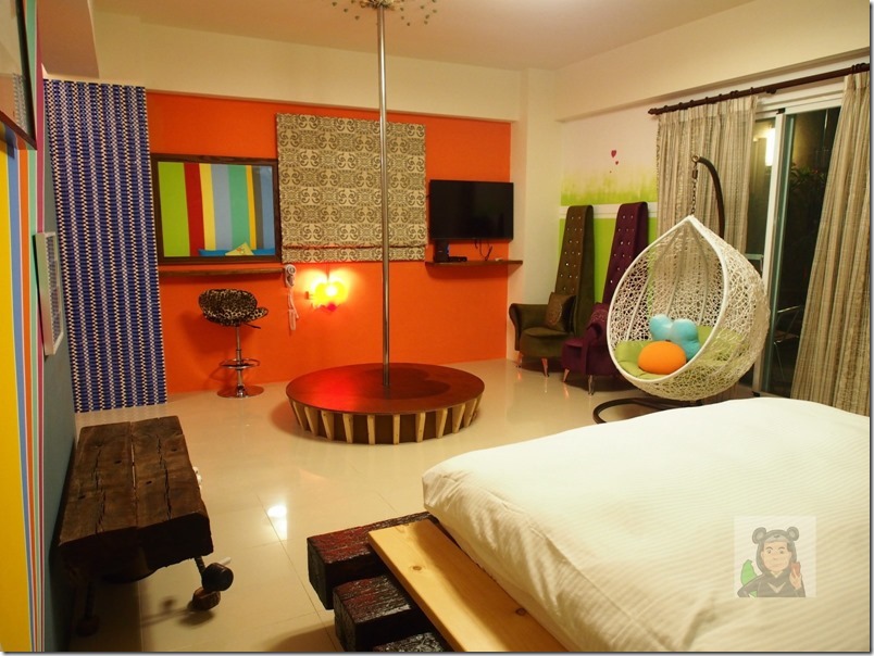 對!你沒看錯…除了超大好睡的大床之外,還有舒適的吊籃椅…鋼管…是的這間屋內有鋼管…還有繽紛與藝術塗裝佈置的藝術風格…想開趴…是嗎? 哈哈哈~~~ 包棟的時候這一間當作熱舞空間應該不錯!