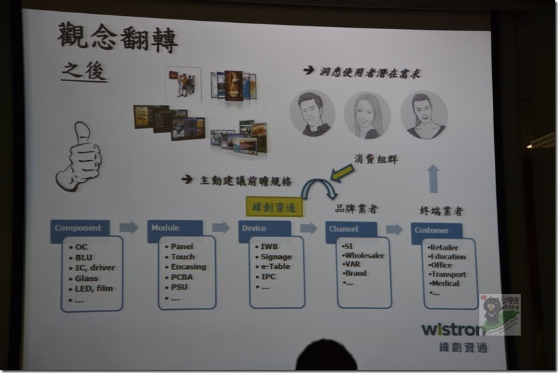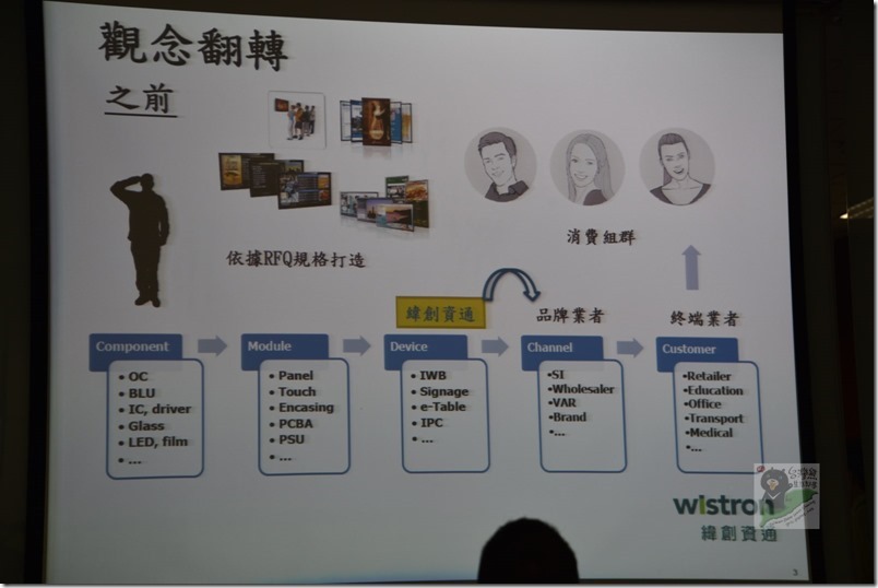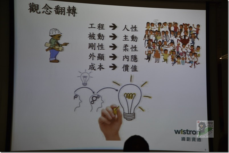 一開始就直接破題,由翻轉前與翻轉後的變異,看到使用者在開發、設計、製造、應用的流程中位置的變化。翻轉後明顯的以緯創的位置而言就是由RFQ規格導向改為融入使用者經驗的主動出擊作為。