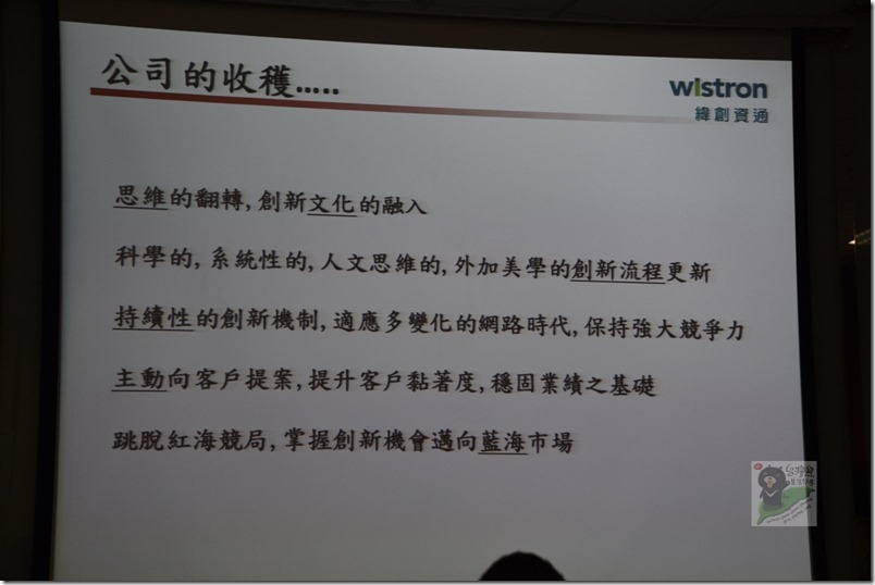 由緯創分享的公司收穫中,呈現的就是設計思維核心到實質產出的改變,也就是不只外在上的變化,而是核心的設計文化上的內在改變。同時藉由這樣的專案作為,建立持續性的機制,成為設計生產中的一環,藉由不斷的創新與主動的作為,提升競爭力,讓緯創跳脫競爭紅海,邁向藍海市場。