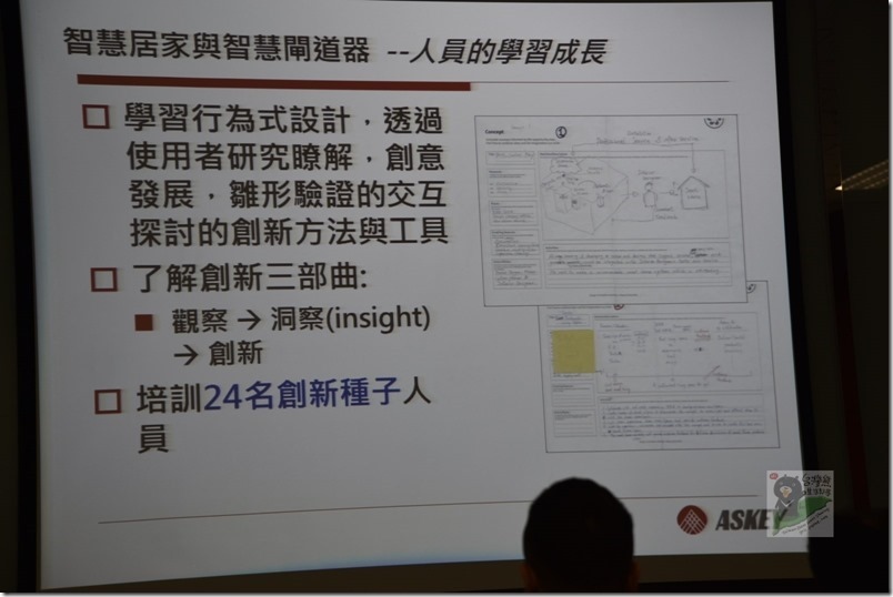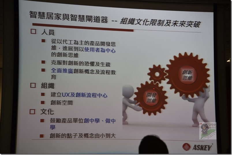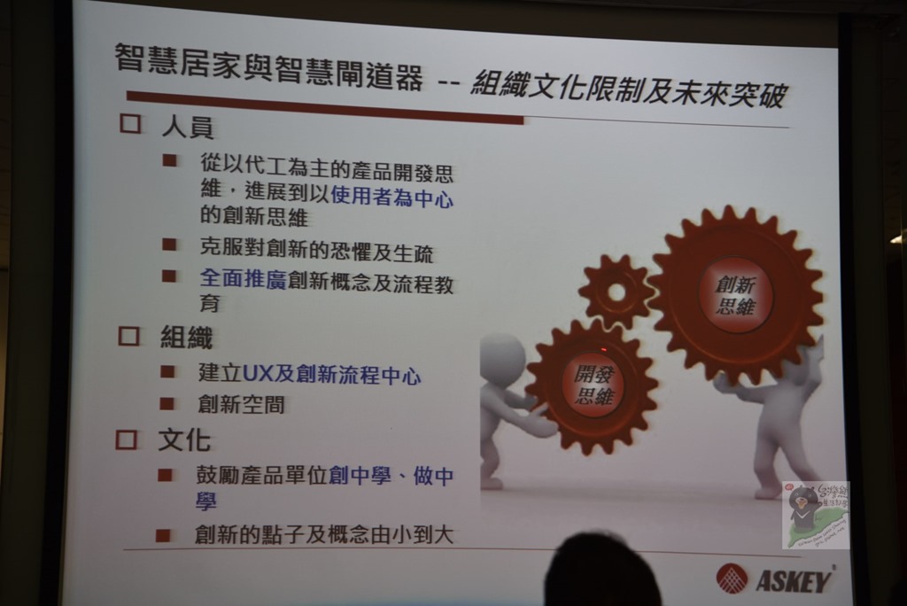 亞旭ASKEY是一家相當資深的ICT廠商,在數據機生產曾經是國內執牛耳的廠商之一。亞旭以「創新文化建立與突破智慧居家與智慧閘道器」為題做專案發展經驗分享。