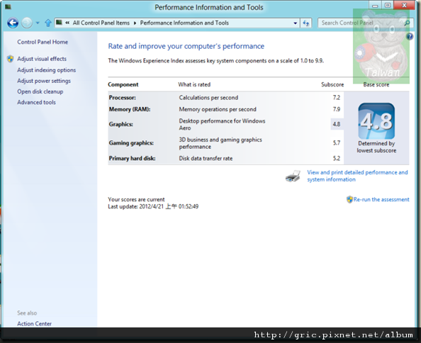 Windows 8 效能體驗指數 7.2 / 7.9 / 4.8 / 5.7 / 5.2 ,在Desktop…Windows Aero 還有 3D … Graphics performance 兩項指數上互有增減。