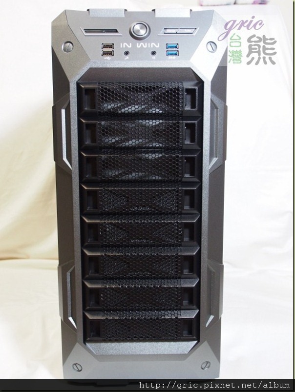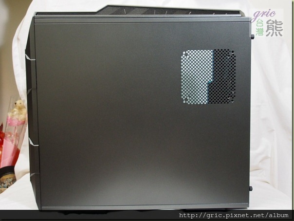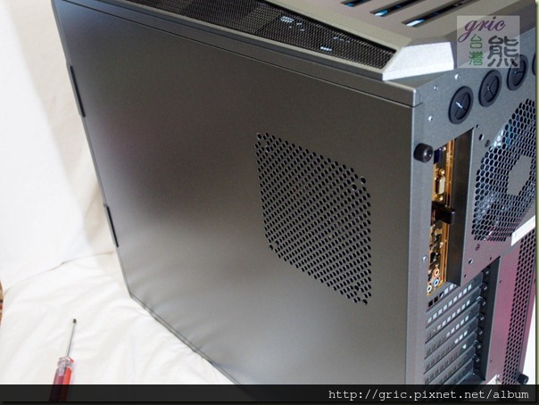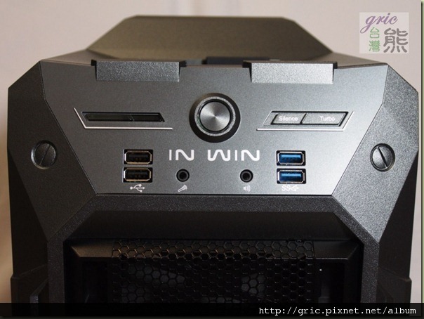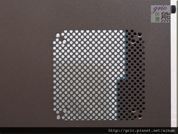 之前有一些品牌有推出側透明窗…還開了孔,結果被部分網友給轟醜斃了,不知道是不是因為這類似的評論還是因為In Win自家的產品的規劃因素,GRone並沒有在透明側窗上開出散熱孔或是預備安裝散風扇的開孔,不僅如此迎廣還將IN WIN字樣給烙了上去,不只如此…您有沒有注意到…這整個透明窗就是一個胖I的造型。