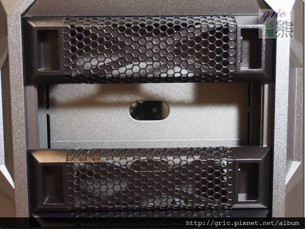 另外前面板5.25”控充槽看起來好像很多,其實是區分為上下段,上面四大有三大可以使用,下面蔞空設計是為了配合裡面的硬碟架或是搭配長顯卡怪獸卡來裝置12或14公分的風扇可以使用,這樣的面板設計還蠻特殊的很容易取下清理面板上的積塵喔!