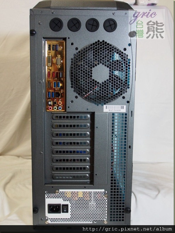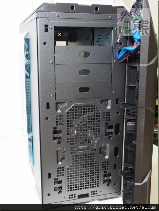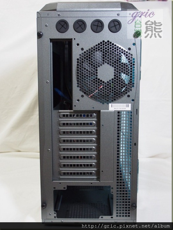 機背設計考慮冷排管線問題絕對是一件合理的事,而這開孔在非使用水冷風扇的使用者也有機會用到的,對啊!像是一些新一代旗艦或是高階主機板現在都有內建WiFi與藍芽無線裝置有一些還有搭配延長的天線,之前有一些機殼…是不會給這些天線”出路”的,GRone就很大方地給了四個孔…XD。機背的孔可以同時適用12/14公分的風扇,目前預裝的是12公分散熱風扇。還有剛剛提到的圖I24 CPU下方開孔,這個開孔看得出也預留了加裝風扇可以用的螺絲孔…所以有需要的話應該可以試試主動送風或是抽風的效果也不錯啦!