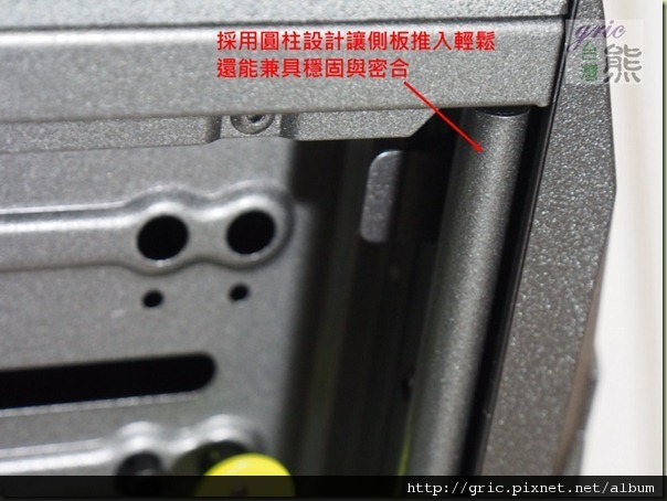 重量就是來自真材實料!不只是透明側窗有深度還特別用螺絲固定增加強度,基本上鋼板厚度足足有0.8mm之厚,與機殼接觸的面還折成ㄇ字造型一來增加強度二來對密合度應該也有一些幫助,然後前方與側板嵌合的立面用心用料的採用
