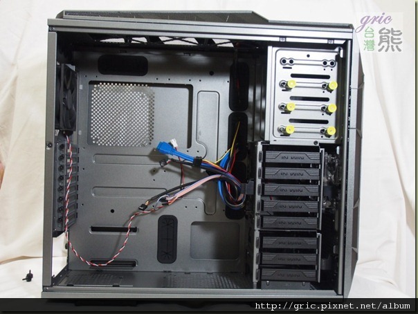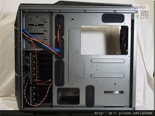 打開側蓋之後熊感到滿意與驚喜,不只是線孔都裝了橡皮護圈而已,更重要的是POWER鄰近側的那個孔開得太好了,因為這樣的位置對粗壯的24PIN主電源線甚至VGA電源線與4/8PIN電源線可以有好的路徑可以安排與便利的整線方式產生,這在後面裝機測試時可以簡單地呈現與比較看出。