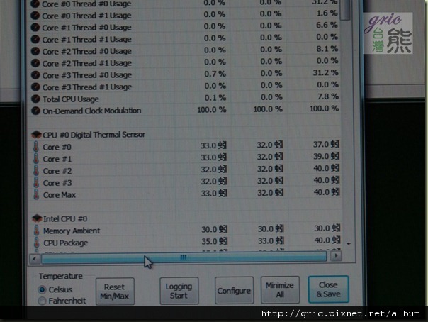 圖 I58 封殼後開機後十分鐘觀察一下CPU溫度32~33度之間,可見IN WIN GRone 與 Tt Contac 30的組合搭配是一組不錯的搭檔。