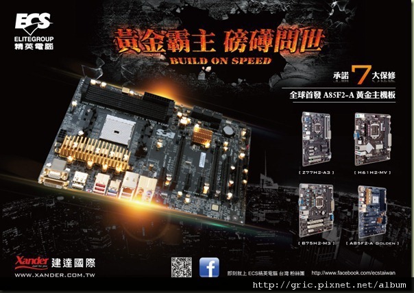 精英電腦將在台灣正式開賣:全球第一片AMD黃金主機板A85F2-A GOLDEN,在用料上首開業界創舉採用黃金散熱介面,特殊造型散熱鰭片將大幅提升30%的散熱性能,更搭配Nonstop獨家72小時50度高溫燒機(Super Burn Test)認證,強勁的產品規格與高水準的品質標準,勢必將新一代FM2平台發揮至效能極限!另外強打Z77H2-A3主機板也升級精英eOC軟體可細部調校與優化性能,DDR3可直達2800MHz,提供極致的遊戲體驗!