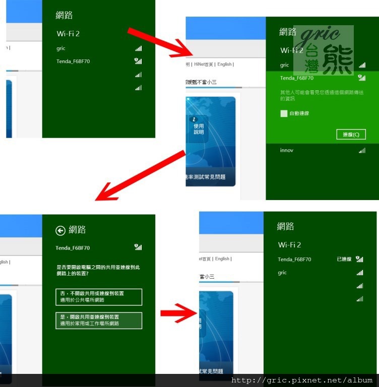 Win8在網路設備的初始設定畫面上與之前的Windows確實都不一樣,將四個步驟集合成圖T24流程供您參考,先將系統的無線網卡與A6無線分享器連結起來。