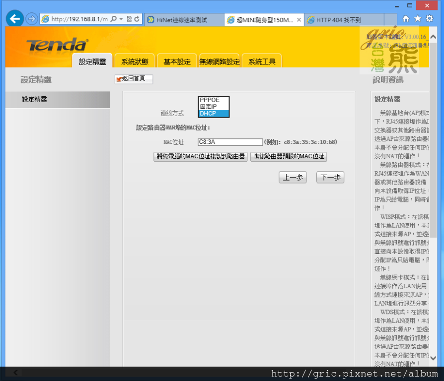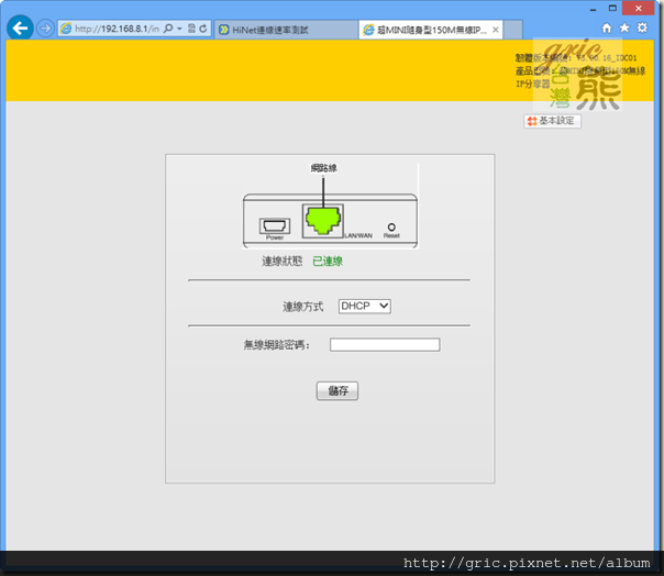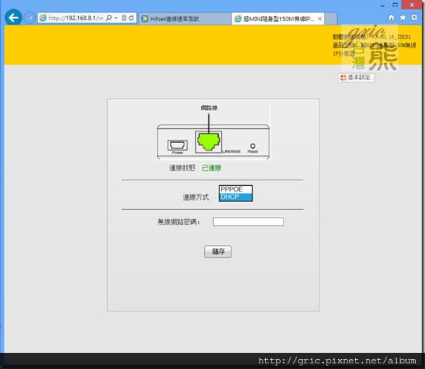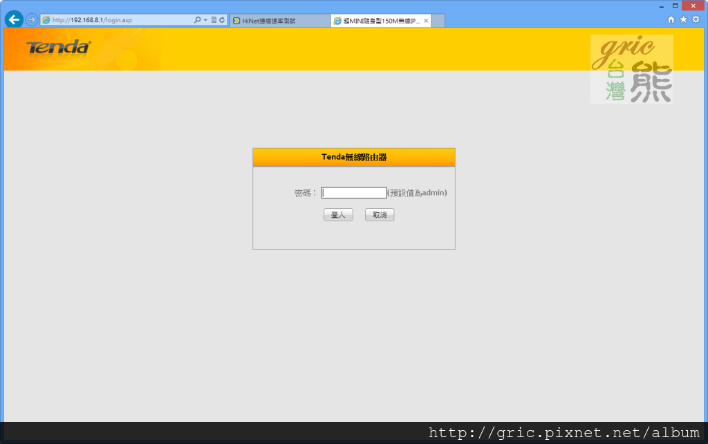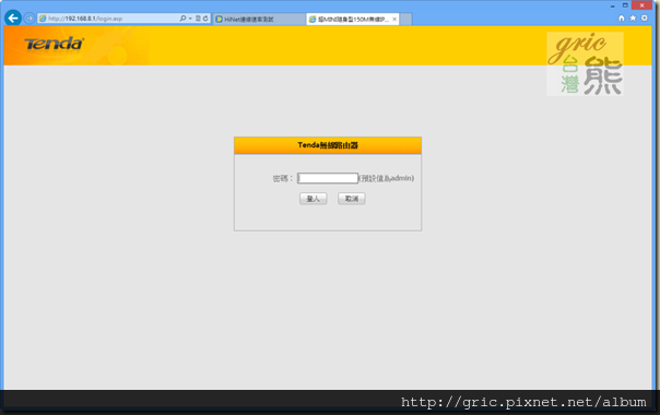 圖 T25 在瀏覽器(IE 10)輸入192.168.8.1即可進入A6的設定畫面,預設密碼admin。