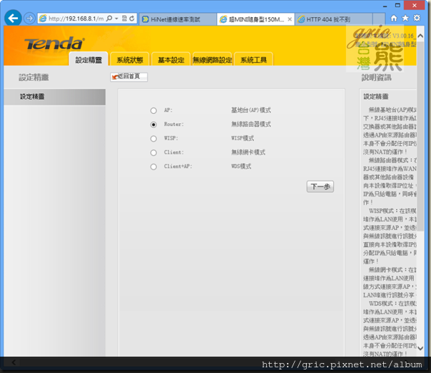 工作模式:AP、router、WISP Client+AP、client 五種工作模式