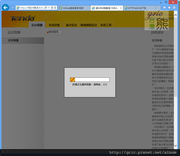 Reset鍵與重新開機是使用同一個小孔,以頂壓時間長短來區別,所以不要頂太久以免把已經設定好的設定值都給重置掉了。(建議Tenda A6手冊中加註壓按幾秒會RESET的註記)