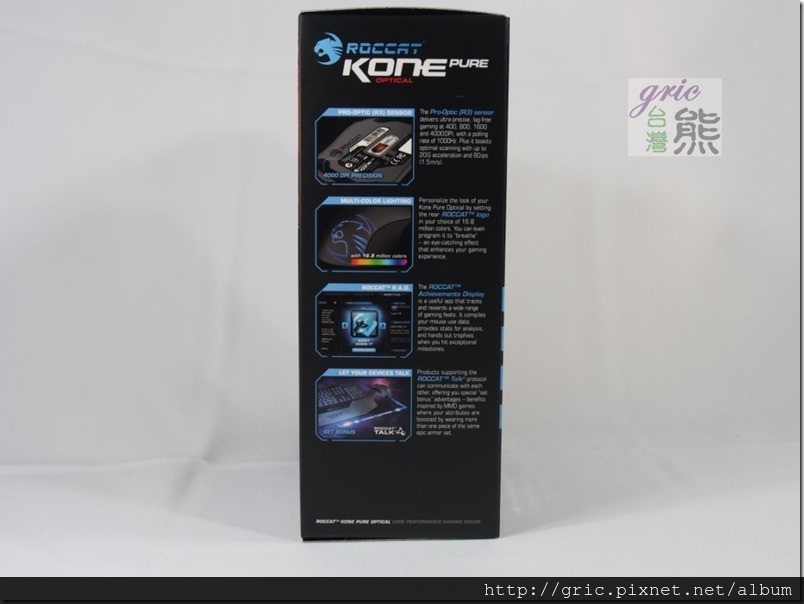 圖 O08-O14 開箱了嗎?沒有啦…這樣的設計可以將Kone Pure Optical的按鍵功能標示上面,提醒使用者善用。當然還趁機將一些滑鼠特色標印在上面,包括強調MID-SIZE、易握持控制的造型、內含CPU與可搭配軟體進階控制,還有特別強調的2D TiTAN WHELL滾輪技術。Kone Pure Optical還有ROCCAT TALK通訊協定功能…等。