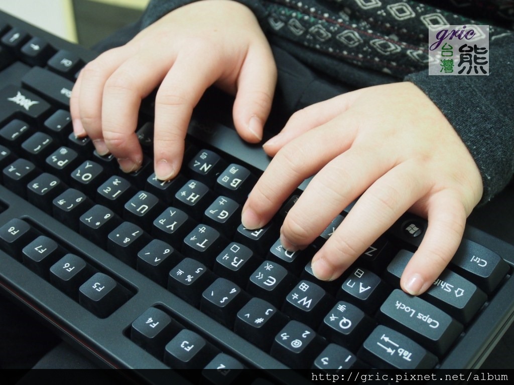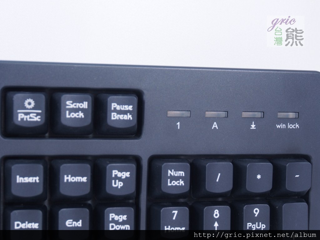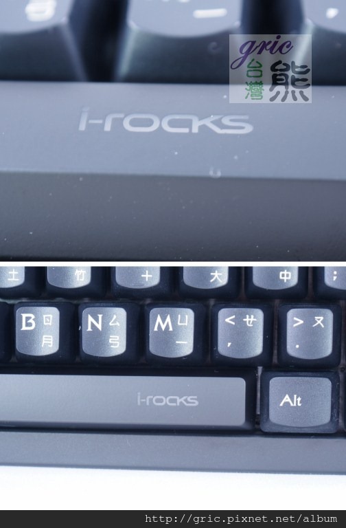 沒錯前面提到混用材質,其他鍵是PBT而這空白鍵是ABS,而且SPACE BAR右下方放了綠光LED,SPACE BAR鍵帽簍空雕印i-rocks字樣,也是跟上時代流行不是單調的印Space字樣,所以工法也增加了一項,開啟與關閉綠光LED的方式是壓按「PrtSc」鍵3秒鐘不放就可以了。(人是貪心的…熊也是,如果F與J定位鍵下方也放一下LED燈部一定要簍空是會有助打字定位…?還是多此一舉?嗯…可以想一想。)