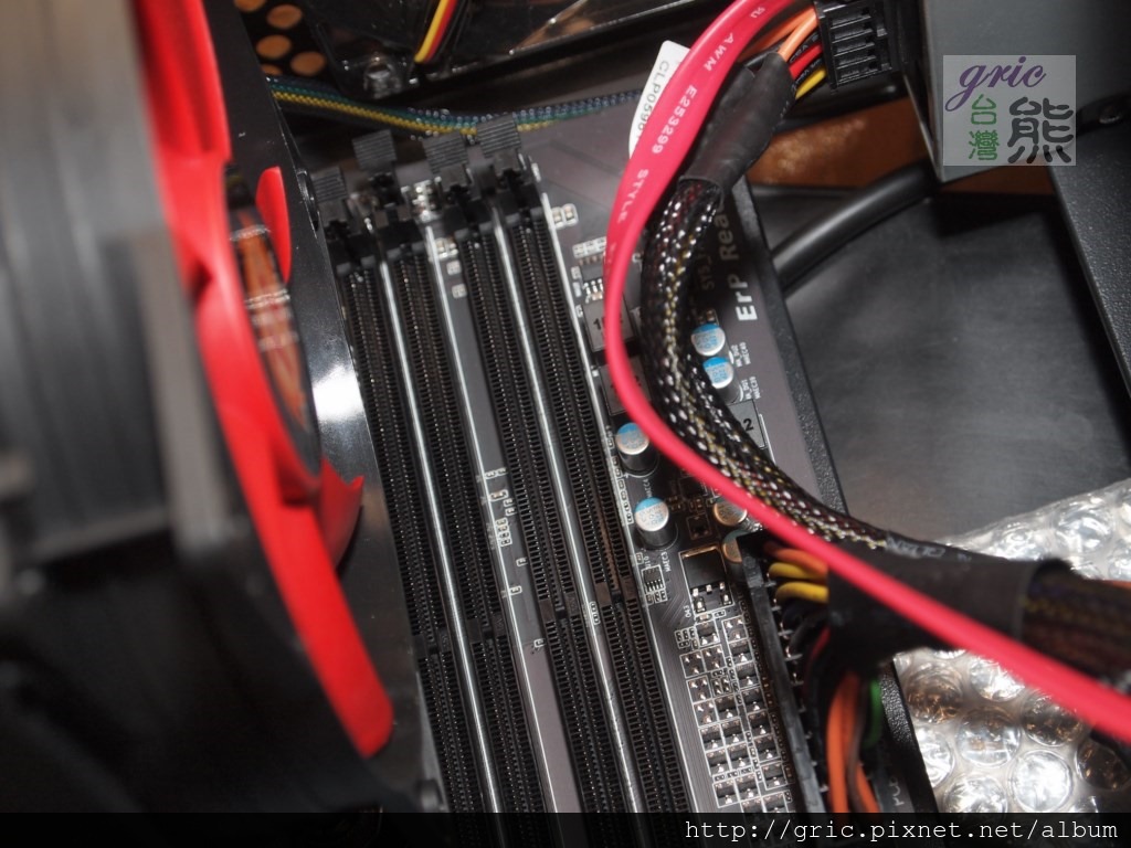 注意到了嗎?這時候記憶體得要斜插,像示範的這一組膏督剛剛好不會頂到散熱組,可以要斜斜的插進去看得出是不容易的!