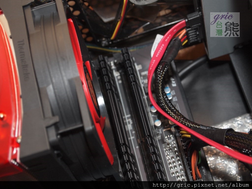 圖 T36 我喜歡這樣赤裸的安裝TT Frio Advanced,因為風扇含座整個扣上去比較方便,而且在栓中央螺絲的時候比較手順。(這時候可以發現因為記憶體已先安裝且高度OK,所以可以利用到內側插槽)