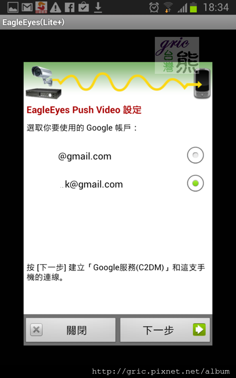 圖 A29-A31 一開啟EagleEyes(Lite+),軟體就要熊選用EagleEyes視訊推播所要用的google帳號,顯然這已經開始第三步驟的程序。(C2DM:Android Cloud to Device Messaging)