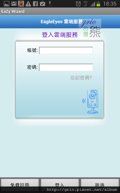包裝上面宣稱不用電腦常識也可以輕而易舉完成網路設定,而且還說1、2、3三步驟輕鬆完成,三分鐘內看到同步影像。剛剛已經完成第一步驟:插上線。現在台灣熊拿出手機給它實作試試第二步驟:下載安裝Eagle Eyes。