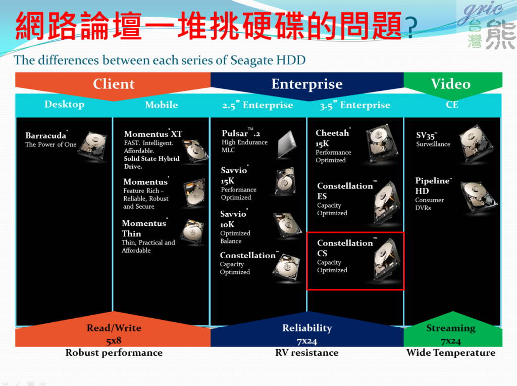 圖 A02 基本上目前硬碟市場也就以SEAGATE與WDC兩家的專用硬碟系列最為齊全,兩家分別都有推出企業級硬碟、NAS專用硬碟、AV影音硬碟與消費型硬碟,而兩品牌也都各有愛用的族群,所以台灣熊才會把品牌喜好列為其中的一個考量項目^_^。