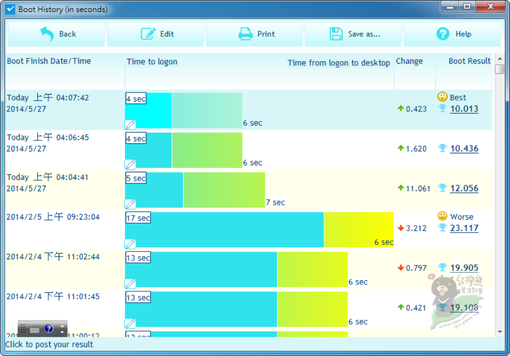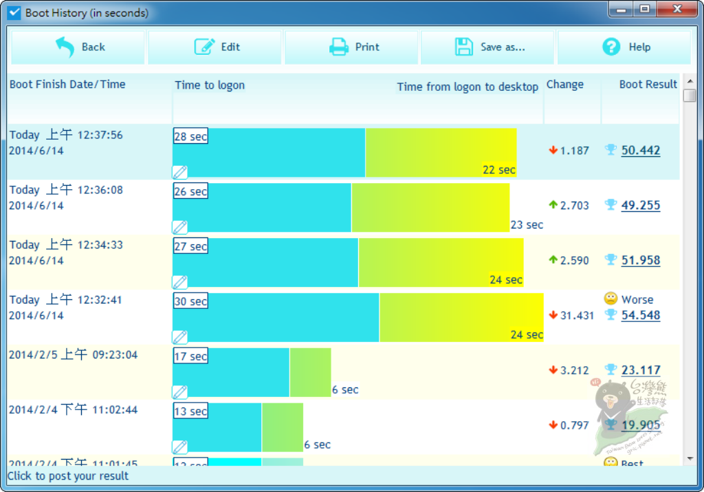 圖 H12-H13 上面的數字呈現是多數的數據是SSD優於HDD,但是少數的數據卻也發現HDD有他的一點點特性上的優勢,在連續寫入的部分比較明顯。接下來看一般人比較會有感覺的開機時間測試。